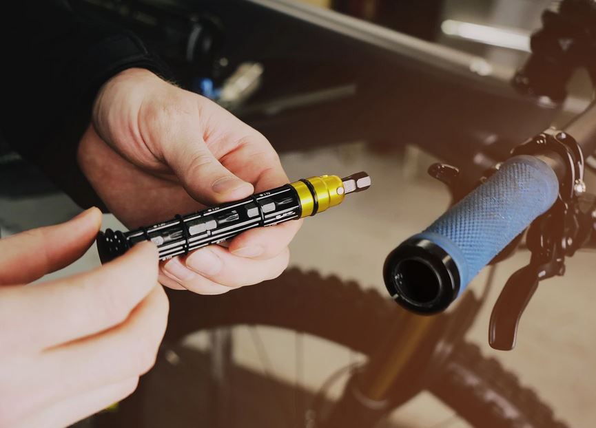Innowacyjne ukryte narzędzie wielofunkcyjne do rowerów górskich, które dyskretnie i bezpiecznie wkłada się w otwór kierownicy. Jest zbudowany z lekkiego, wytrzymałego aluminium obrabianego maszynowo i zawiera bity z hartowanej stali. Zestaw jest łatwo dostępny w celu szybkiej naprawy i zawiera osiem (wersja medium) różnych końcówek narzędziowych, idealnych do współczesnych nowoczesnych rowerów (specyfikacja poniżej). Służy również jako zatyczka do kierownicy i jest dostarczana z trzema różnymi rozmiarami uszczelek typu O-ring, aby zapewnić bezpieczne dopasowanie w większości otworów kierownicy. Zestaw zawiera (medium): imbus 3/4/5/6/10mm, gwiazdka T10/T25, krzyżak