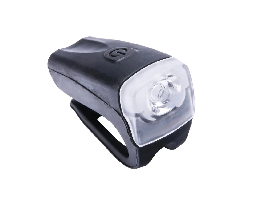 Lampa przednia bateryjna 1-LED ze zintegrowaną soczewką. 3-Watt. Sylikonowa obudowa. Posiada uchwyt do mocowania na rurze kierownicy. Bez baterii AAA.